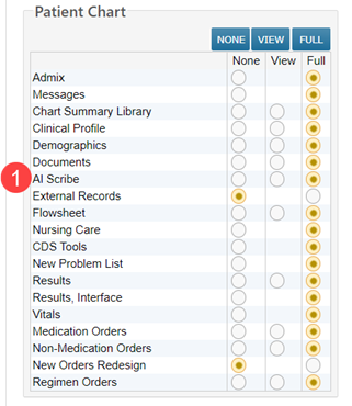 - Full: The user can view and add or edit AI Scribe content in patient charts.