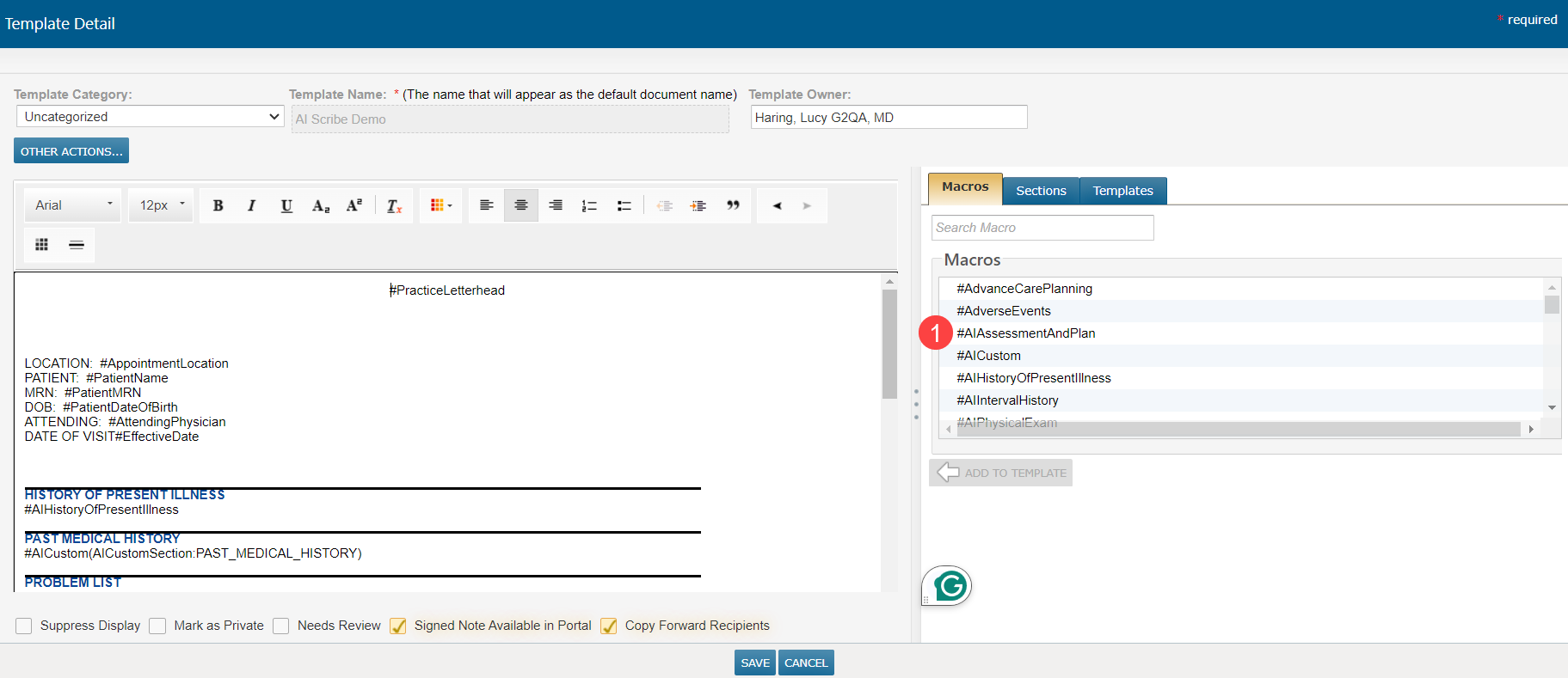 - Open the desired Clinical Note Template and explore the new AI macros.