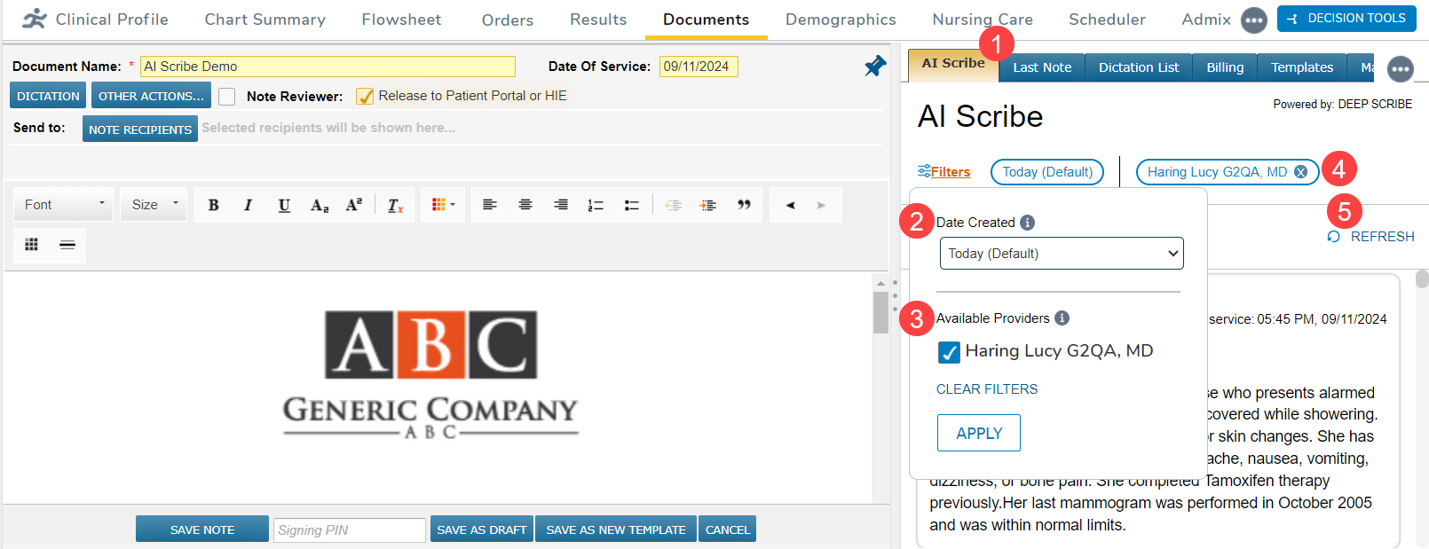 - The tab will show which filters are currently applied to the AI Scribe content (callout 4).