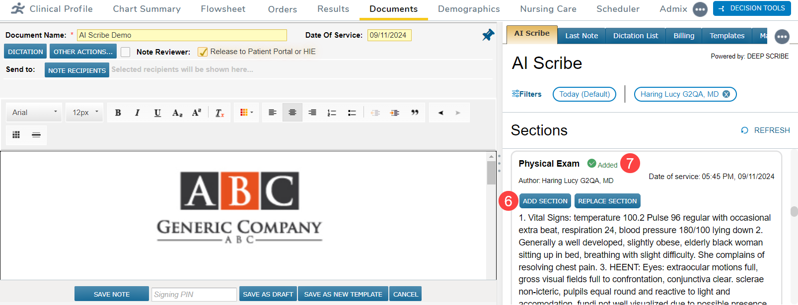 - Add or replace sections in your note with AI-generated content using the buttons in each section (callout 6).