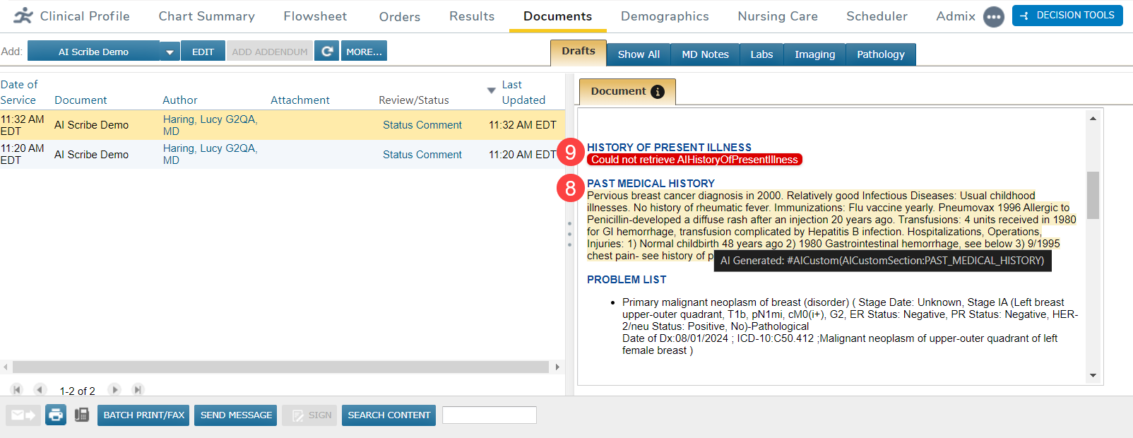 - Access the AI Scribe tab on the right side of the screen (callout 1). This tab shows the content generated from your practice’s AI vendor.
