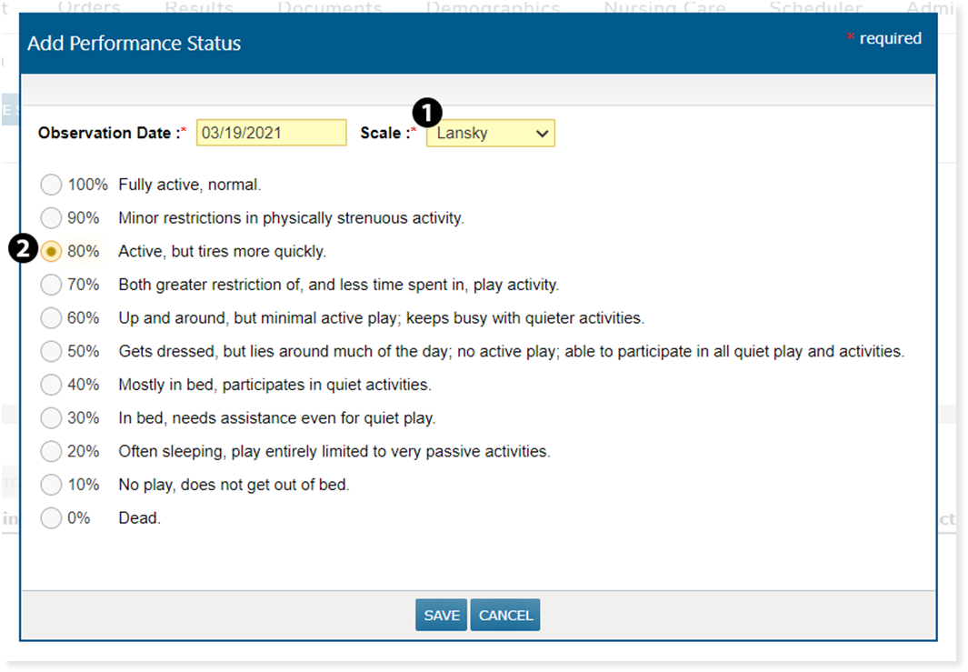 The Lansky Scale is a new performance status scale added to iKnowMed version 3.0.22 and is to be used for patients 16 years and younger. This is an age dependent performance status, so once the patient turns 17, the scale will no longer be available for documentation.