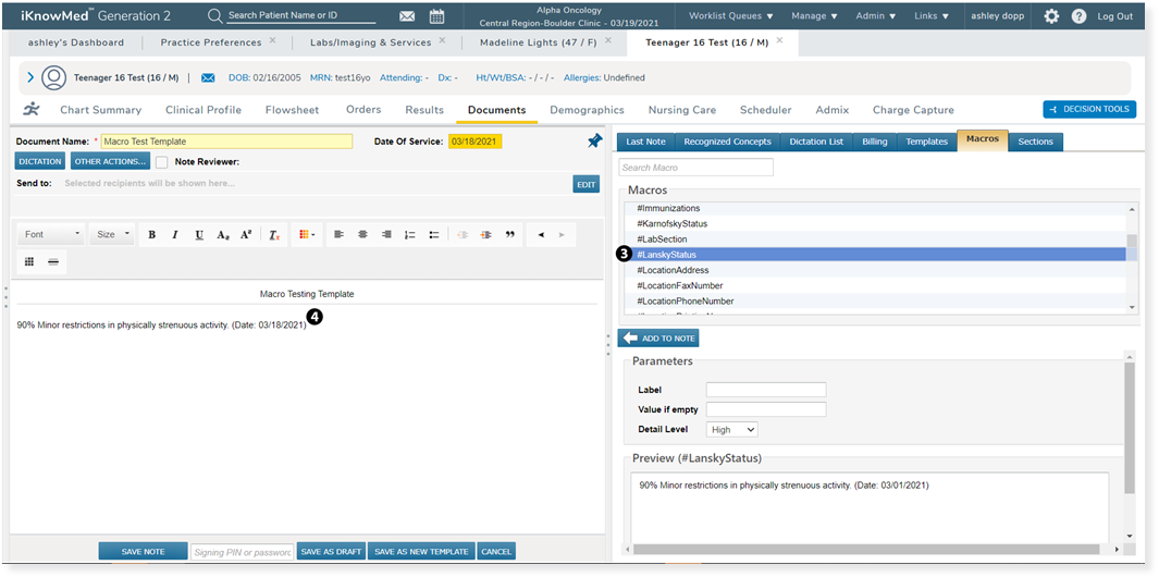 To further support the use of the Lansky Scale, a new macro has also been added to iKnowMed. This macro called, #LanskyStatus allows users to bring the documentation of the Lansky performance status into their clinical notes (see callouts 3 and 4).