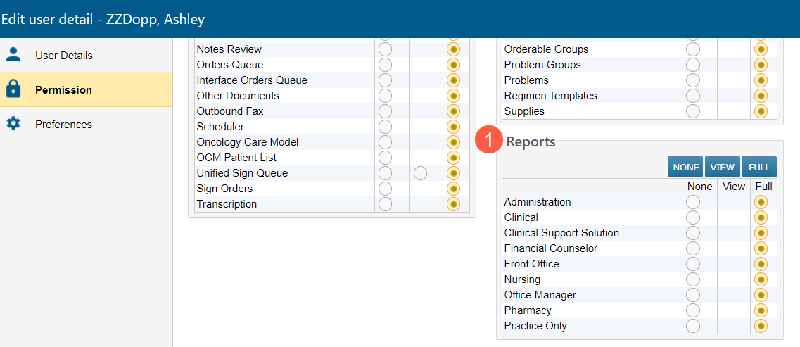 - Go to Permission in the user’s profile, locate the new Reports section, and change each report’s settings from None to Full, as needed (callout 1).