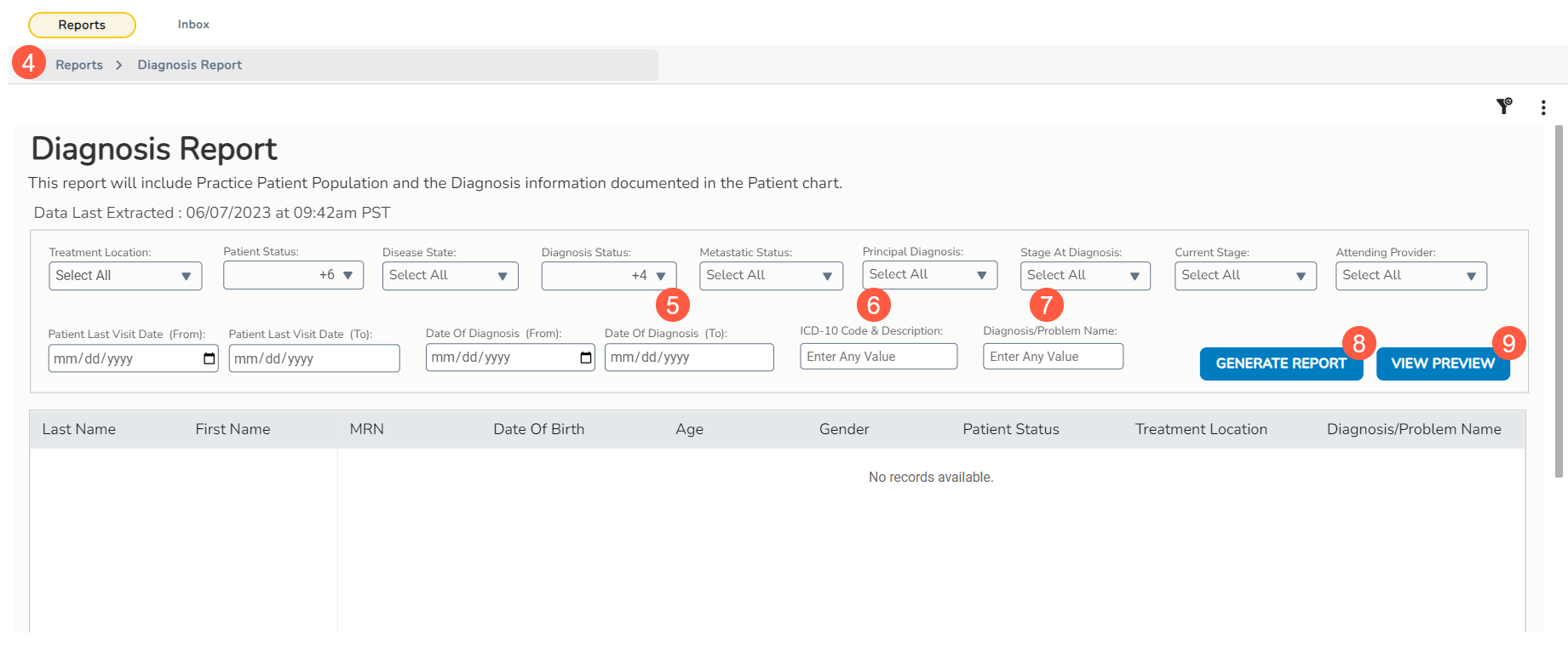 - Once you select your filters, click Generate Report to download the report (callout 8) or click View Preview to see your results in the table (callout 9).