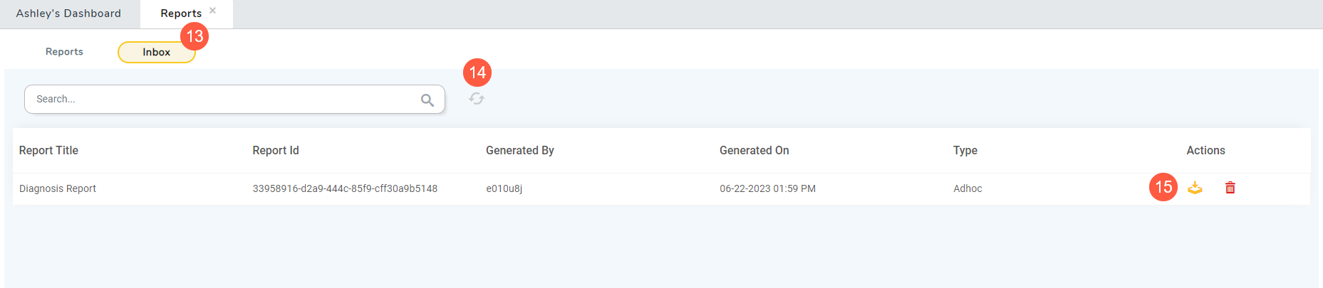 - Click the download icon under Actions to download the Excel report (callout 15).
