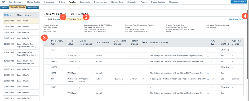 - Open a patient chart and go to the Results page. Click on the new Molecular Results tab.