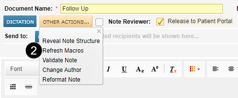 - If a user starts a note today and edits or amends the note the following day, they must choose Other Actions > Refresh Macros to manually update the macros to the current date (callout 2).