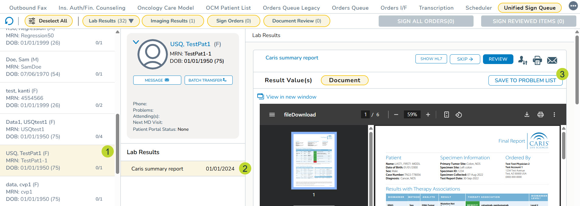 2. In the queue, select a patient with biomarker results (callout 1).