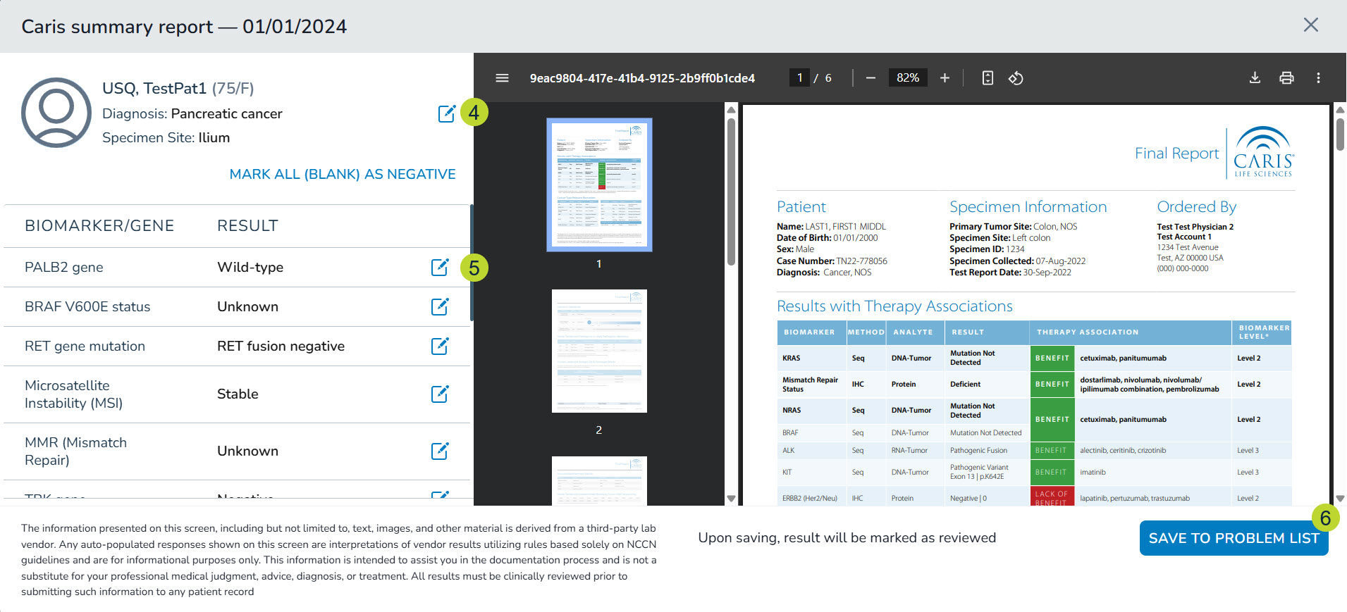 1. The Save To Problem List button will not be enabled if the results are not from a supported solid tumor diagnosis/vendor/panel or mappings are not yet available.