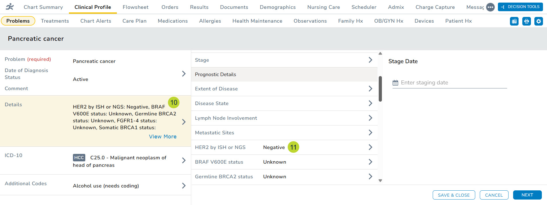 14. You can also open the diagnosis and examine the information in the Details section on the left side (callout 10) and under Prognostic Details section of the expanded details (callout 11).