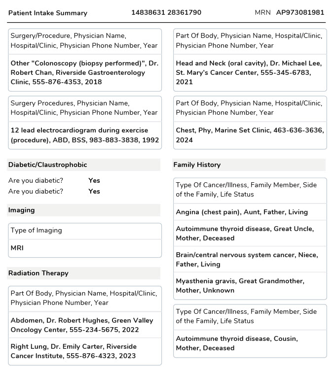 When patients indicate they’ve had imaging done and list the types in the Past Medical History form, both the “Yes” response and the complete list of imaging tests now appear in the Patient Intake Summary. This critical information is now readily available without having to dig through individual forms.