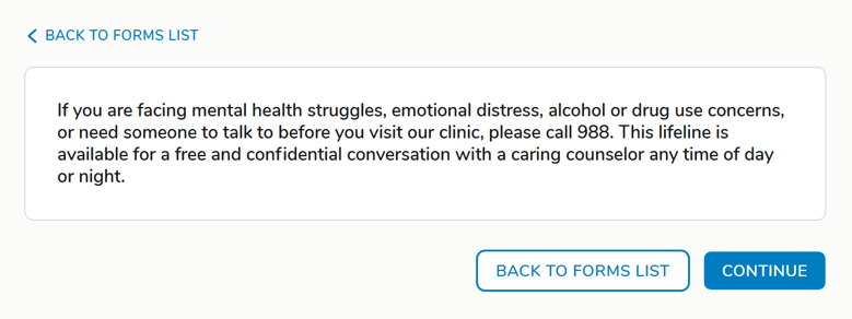 Patients can click Back To Forms List to leave the form or Continue to proceed with completing it.
