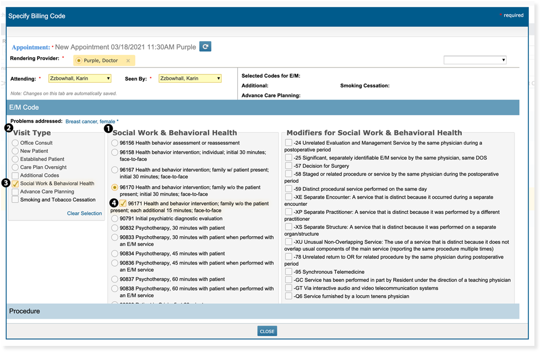The Social Work & Behavioral Health section contains the most commonly used codes that social workers need to add for their visits (see callout 1). This section allows users to bill for their visit without having to go into the Procedure section to add their codes. The Associated Problems in the E/M section will apply to the codes selected under Social Work & Behavioral Health. Users can select codes from this code set or add them in addition to codes from the other codes listed under the Visit Type section (see callout 2).