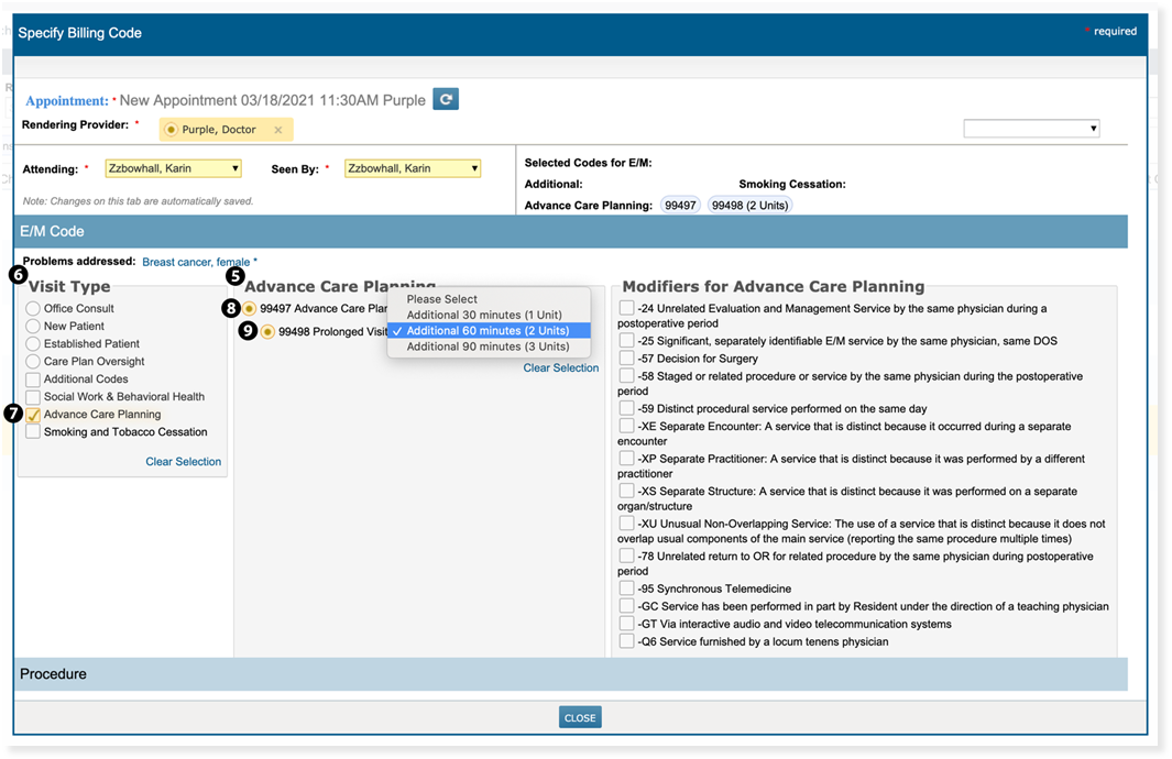 The Advance Care Planning section contains the primary and add-on codes for ACP billing (see callout 5). This section allows users to bill for their visit without having to go into the Procedure section to add their codes. The Associated Problems in the E/M section will apply to the codes selected in Advance Care Planning. Users can select codes from this code set or add them in addition to codes from the other codes listed under the Visit Type section (see callout 6).