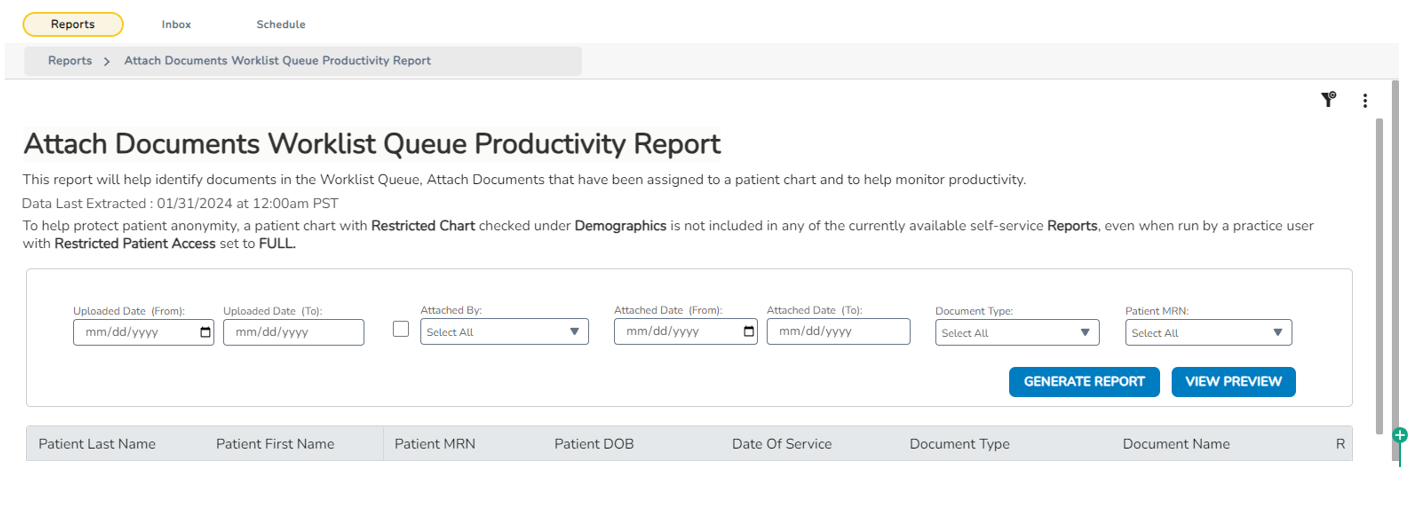 Users with Full Reports permissions in Administration or Office Manager roles can now access the Attach Documents Worklist Queue Productivity Report. This report aids in monitoring productivity by identifying documents in Worklist Queues > Attach Documents that have been successfully assigned to a patient chart.