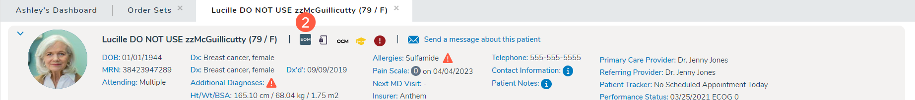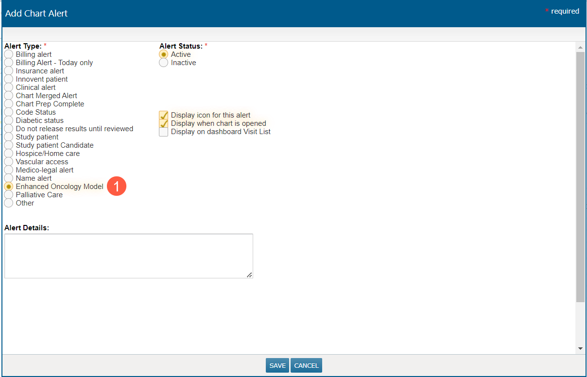 To support the new Enhanced Oncology Model (EOM) program which begins on July 1, 2023, a new chart alert has been added to Clinical Profile > Chart Alerts (callout 1). This new chart alert has a new icon that reads EOM (callout 2). We also removed the OCM chart alert from the screen so that it is not mistakenly added.