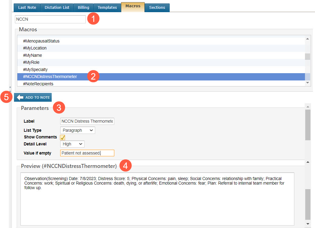 - Locate the Macro: Navigate to the Macros tab and use the search bar to find the #NCCNDistressThermometer macro (callout 1). Alternatively, scroll through the alphabetical list of available macros (callout 2).