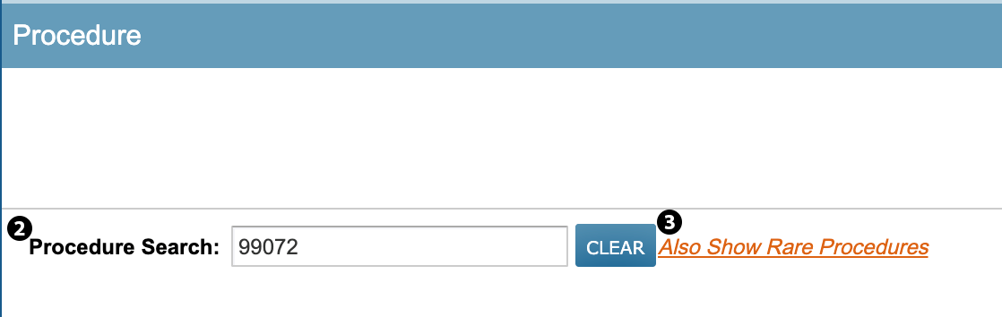 - Use the Procedure Search field to enter a code, such as 99072 (see callout 2).