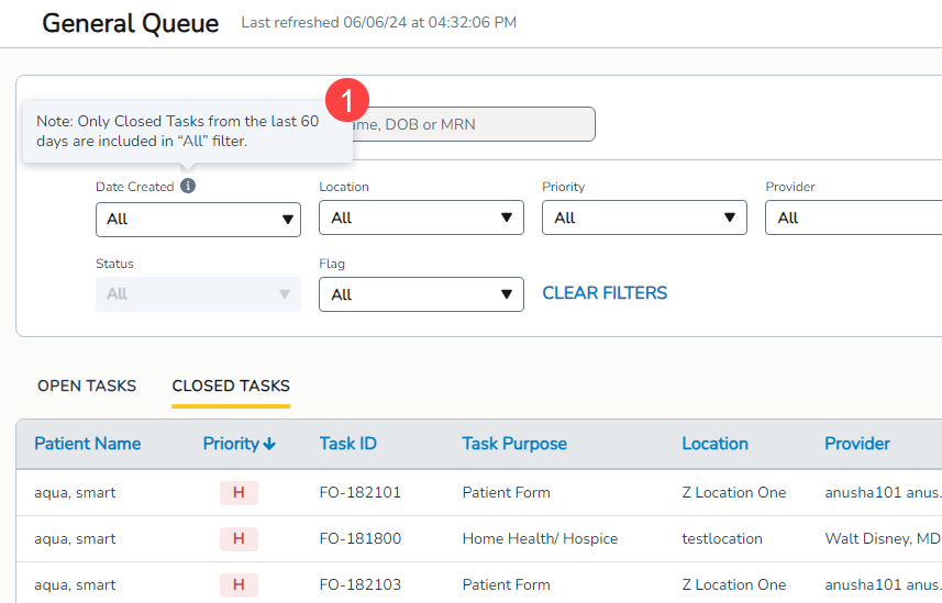 When users select “All” in the Date Created filter, the tooltip will notify users that only closed tasks and messages from the last 60 days are included in this filter (see callout 1 for example).