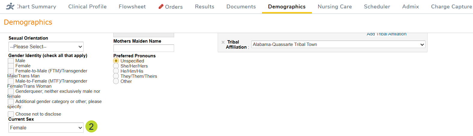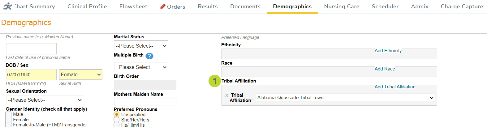 - Tribal Affiliation (callout 1): Document which Native American tribe the patient belongs to by typing into the field to search or selecting from a dropdown list.