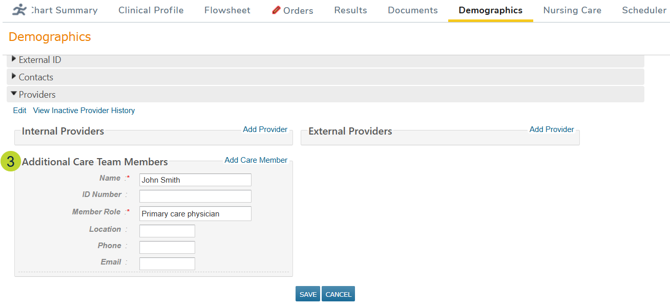 - Additional Care Team Members (callout 3): Document other providers treating the patient, including those who are not iKnowMed users.