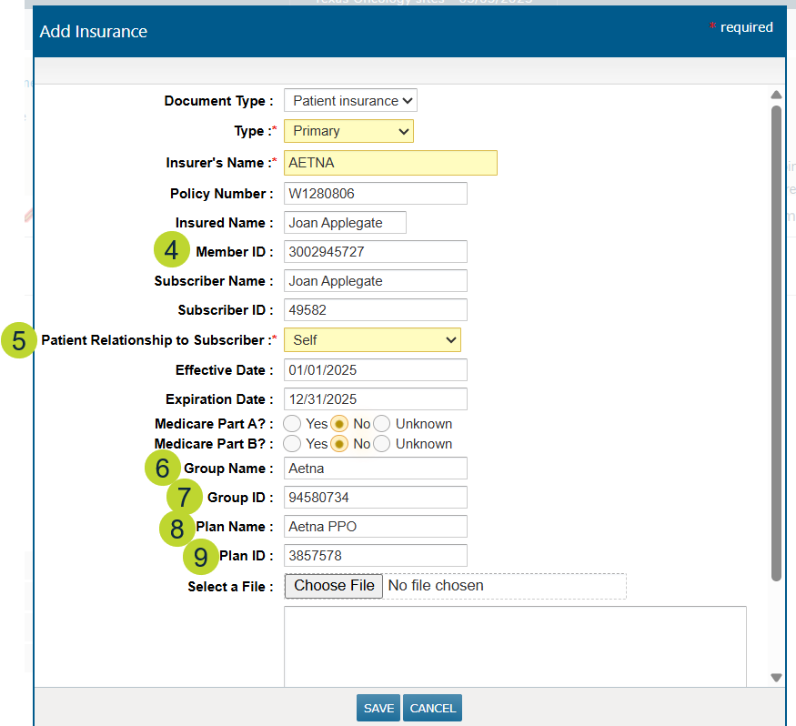 - Insurance (callouts 4-9): Enter additional insurance details using the new fields for Member ID, Patient Relationship to Subscriber, Group Name, Group ID, Plan Name, and Plan ID.
