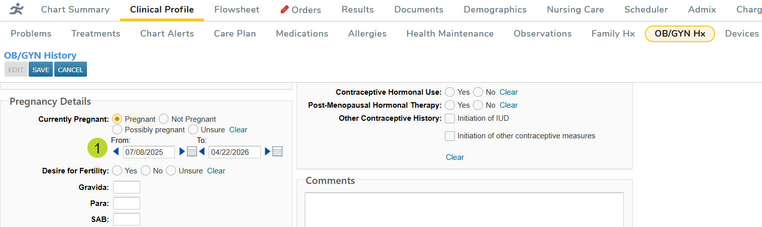 You can now document the full pregnancy timeline for patients. When selecting Pregnant under Pregnancy Details, new From and To date fields allow you to record the start and end dates of the pregnancy (callout 1).