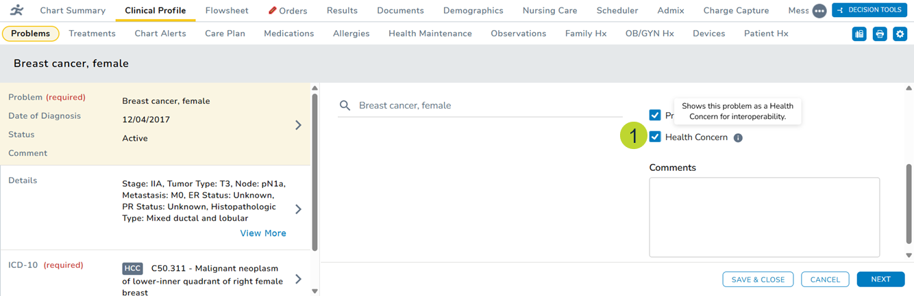 When creating a new problem or editing an existing problem, you can now mark the problem as a Health Concern (callout 1) to indicate that this problem is a health concern when sharing your patients’ most up-to-date medical records with your community partners.