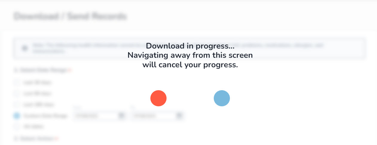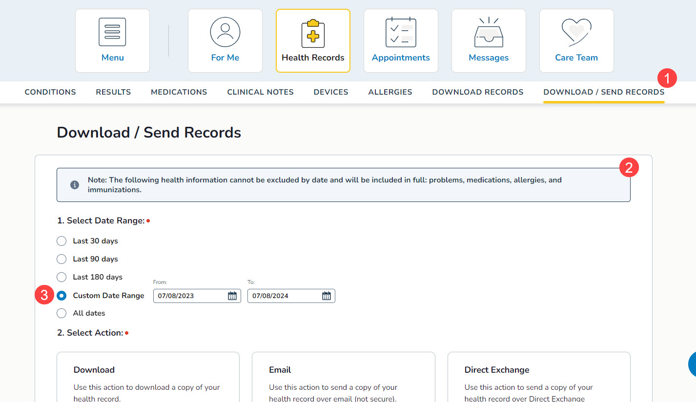 - On the Health Records page, select the new Download/Send Records sub-page (callout 1).