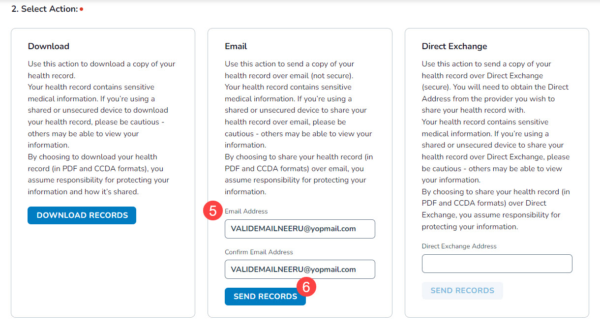 - Enter the recipient’s email address and click Send Records (callouts 5-6).