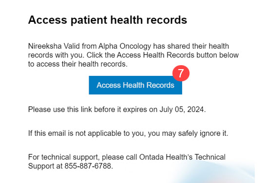 - The recipient can click the Access Health Records button in the email (callout 7).
