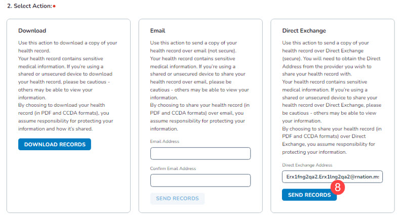 - Enter the provider’s Direct Exchange address and click Send Records (callout 8).