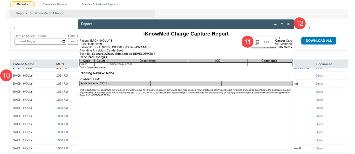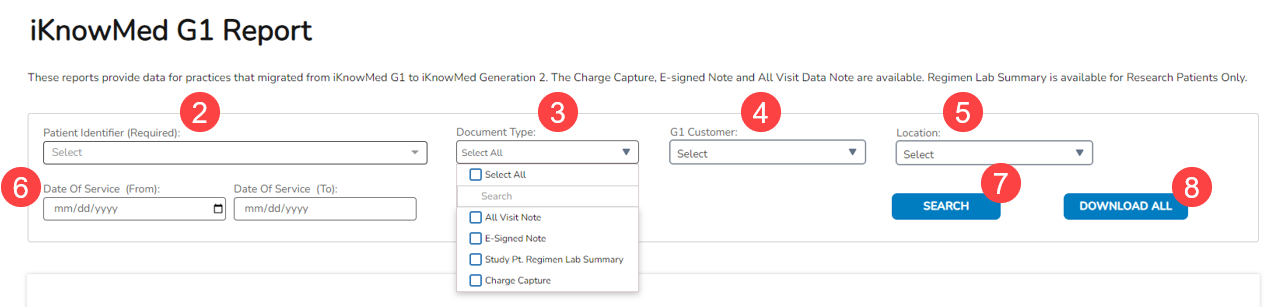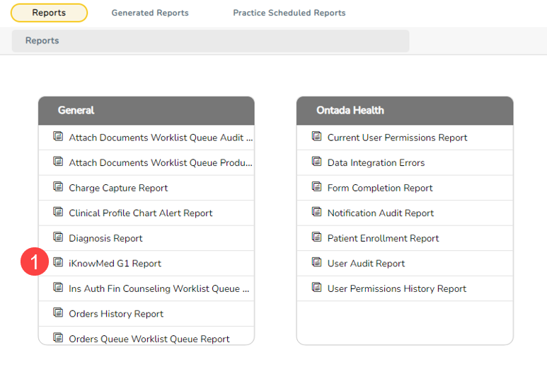 - On the Reports page, find and click on iKnowMed G1 Report (callout 1).