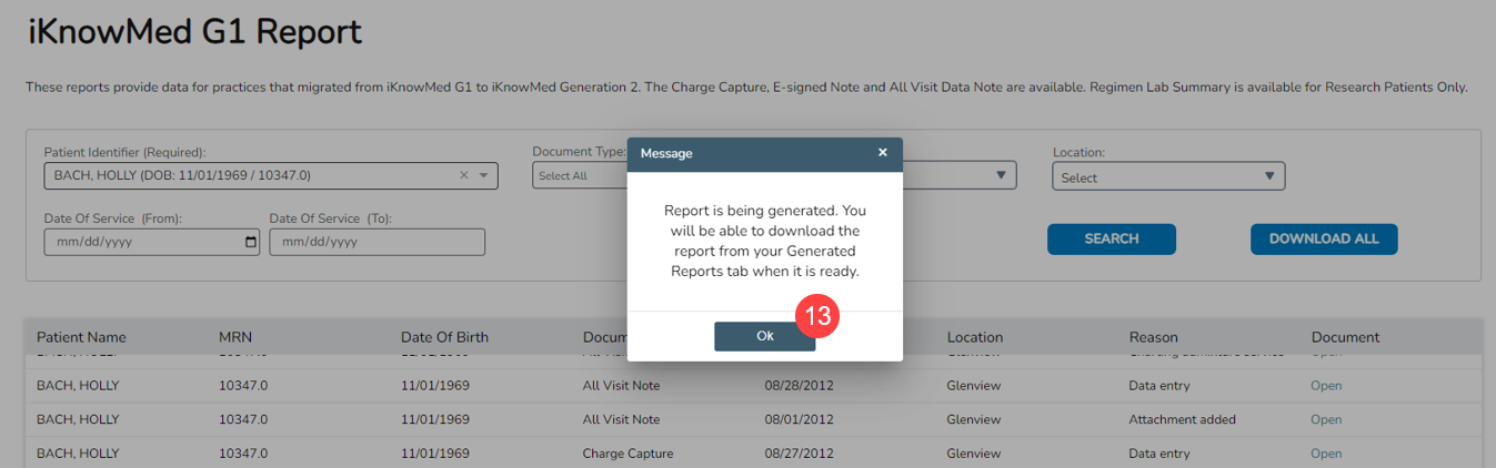 - If you decide to download the report, a window will appear stating that your report is being generated and that you can retrieve it from your Generated Reports when ready. Click the OK button to dismiss the message (callout 13).