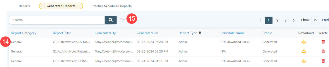 - Downloaded reports will be available on the Generated Reports page (callout 14).
