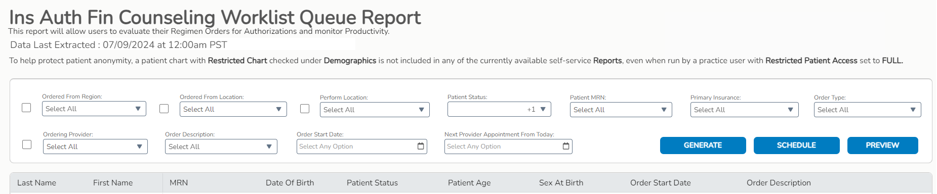 This report allows users to evaluate regimen orders for authorization and monitor productivity across various order types, focusing on regimen order details, so practices can easily track the number of new and remaining required authorizations.
