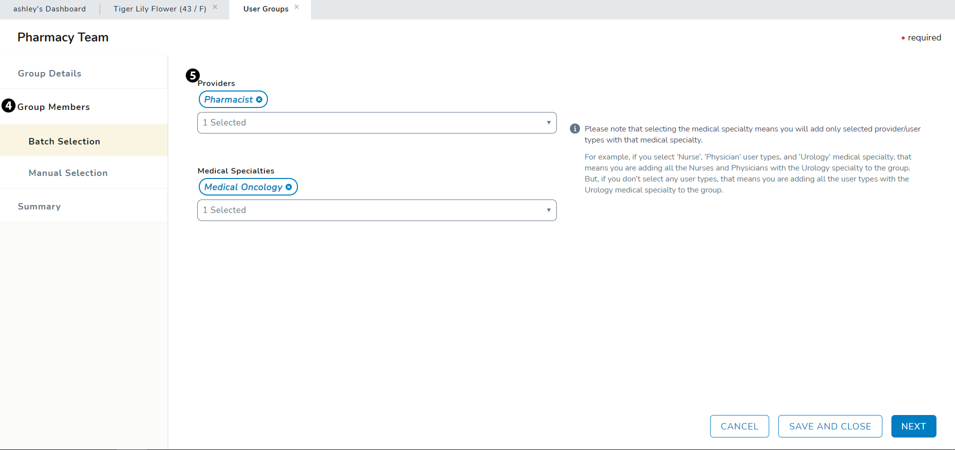 Batch Selection: allows you to choose all users at your practice by provider type or medical specialty. Any users in your practice whose profile is assigned these roles will be included in your messaging group (see callout 5).