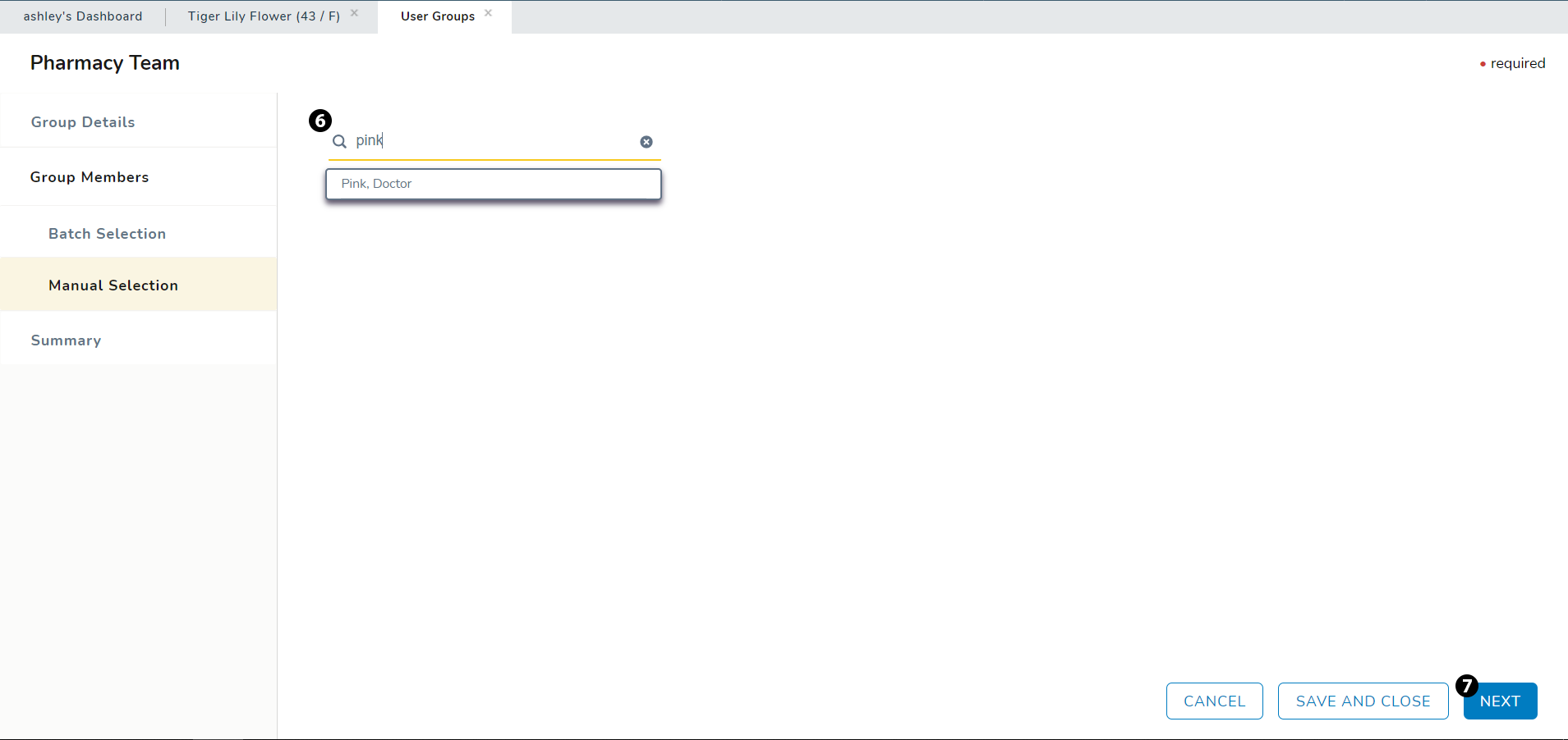 Manual Selection: allows you to search for and add group members individually by their name (see callout 6).