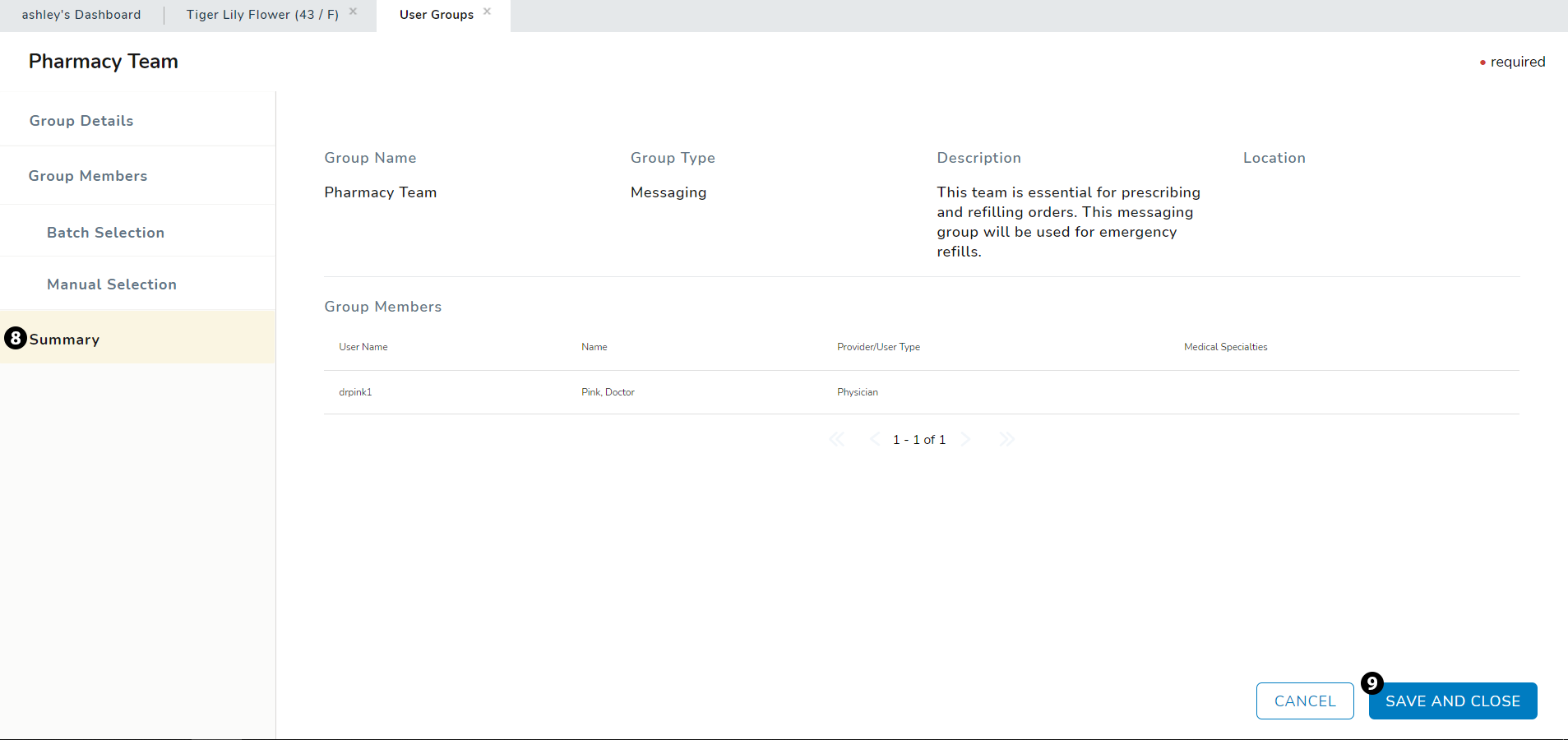 The Summary page displays all the information you entered for this new messaging group. If you need to change anything, simply select an area from the left-hand menu to go back. If all the information is correct, select the SAVE AND CLOSE button at the bottom of the page (see callout 9).
