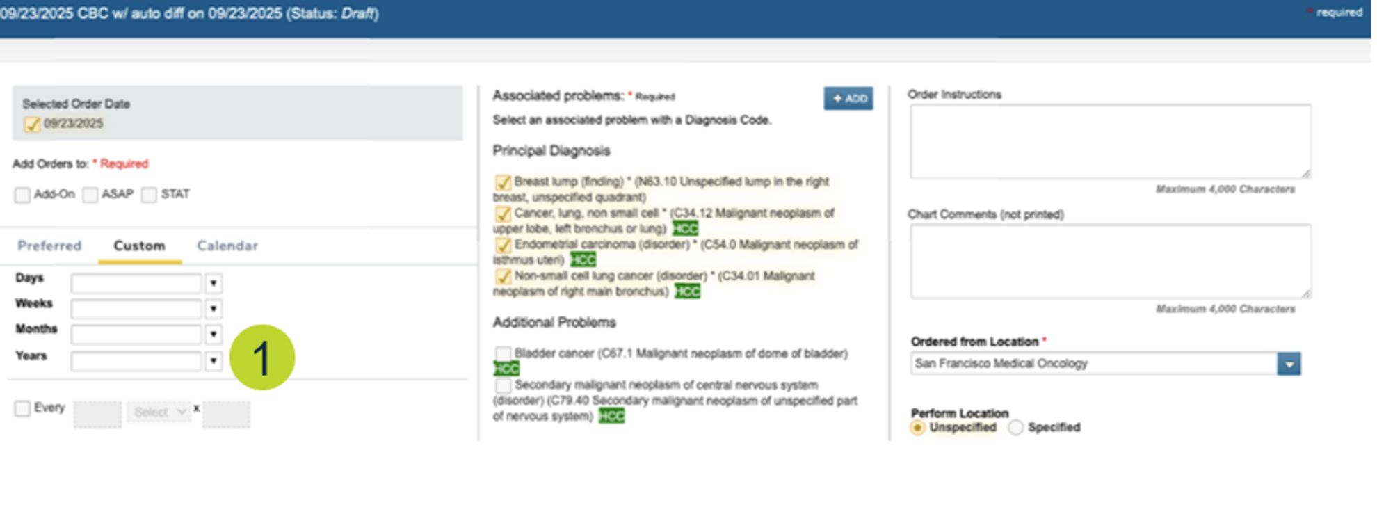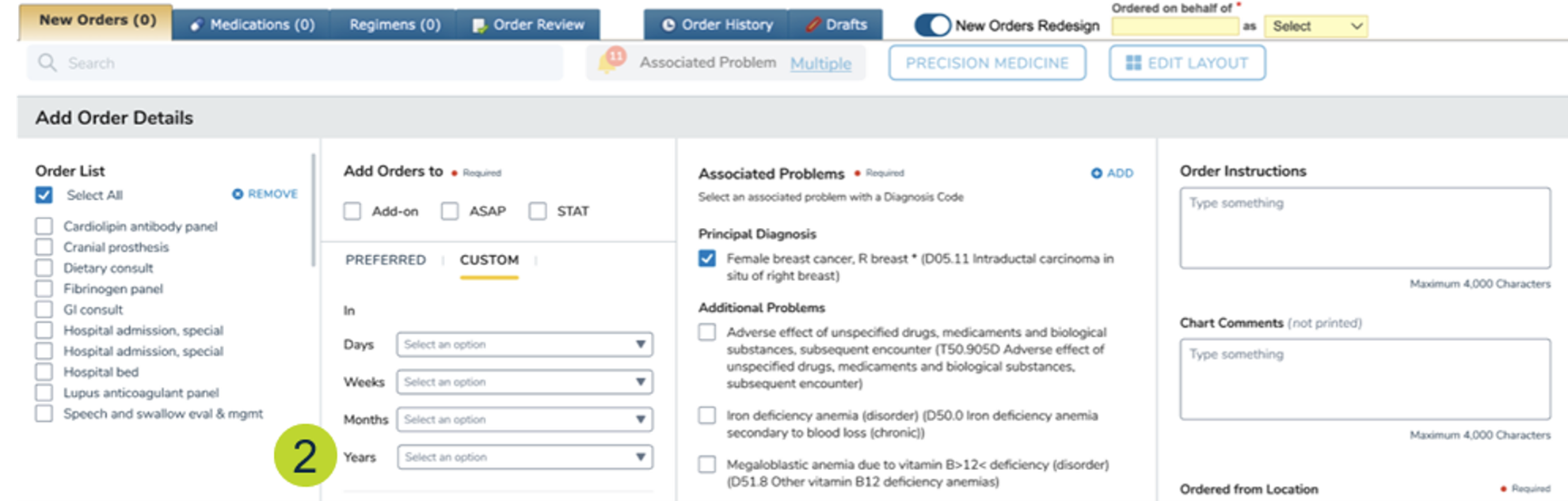 This feature is only available in the redesigned New Orders experience (callouts 1 and 2).