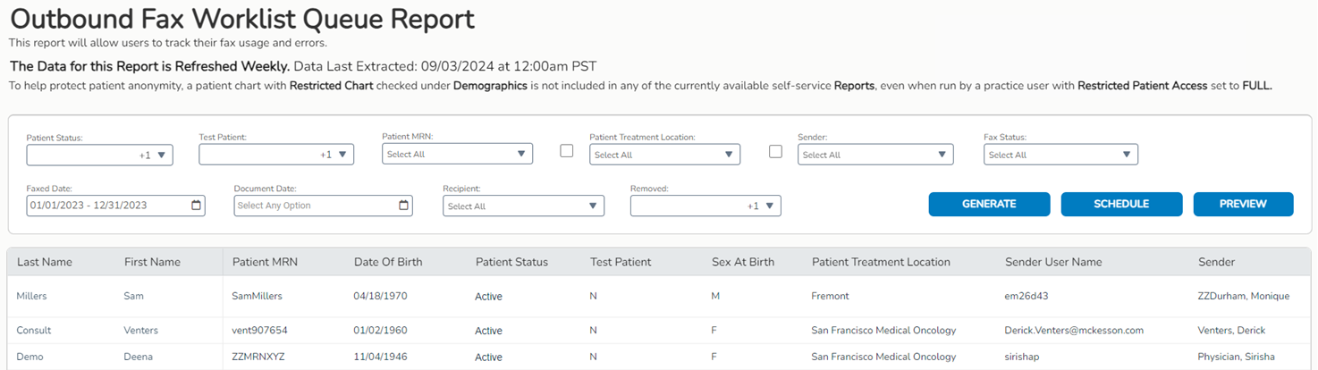 This report provides a comprehensive view of all outbound faxes related to patients, including details such as the sender, fax status, transmission date, and recipient. Practices can utilize this report to track and monitor all faxing activity, ensuring greater oversight of communication workflows.