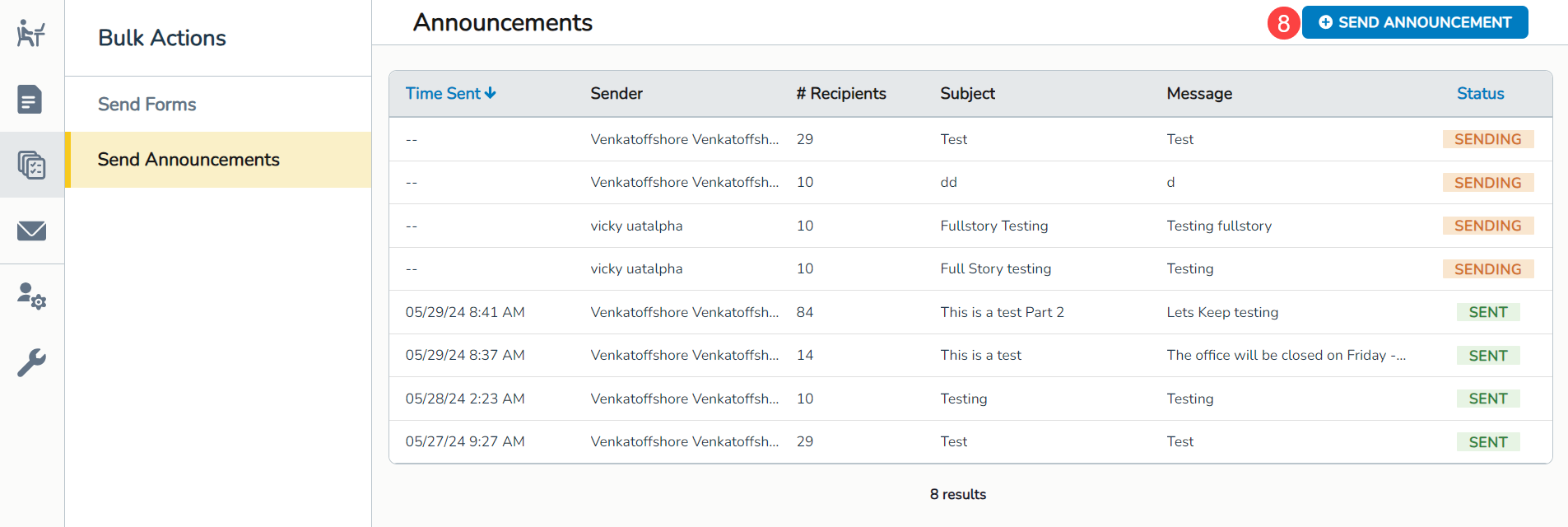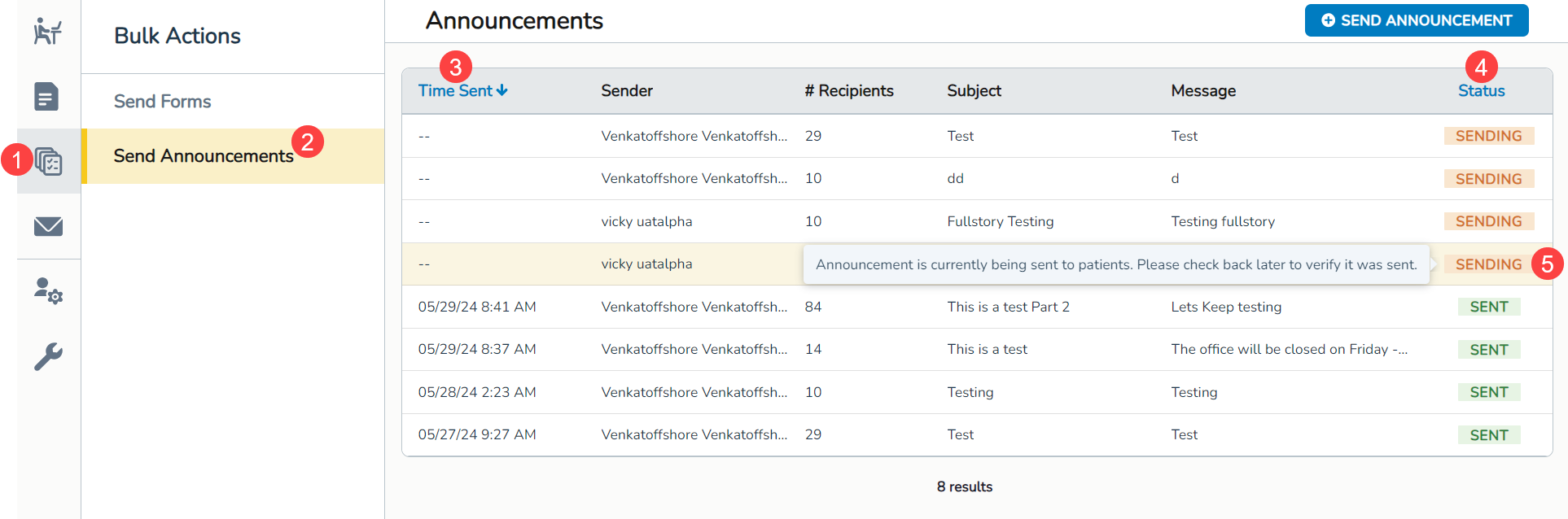 - Click the Send Announcement button (callout 8).