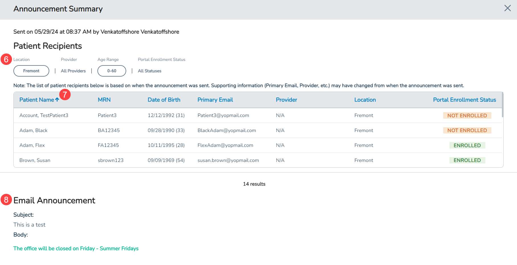 - Location, Provider, Age Range, and Portal Enrollment Status of patients that received the message (callout 6).
