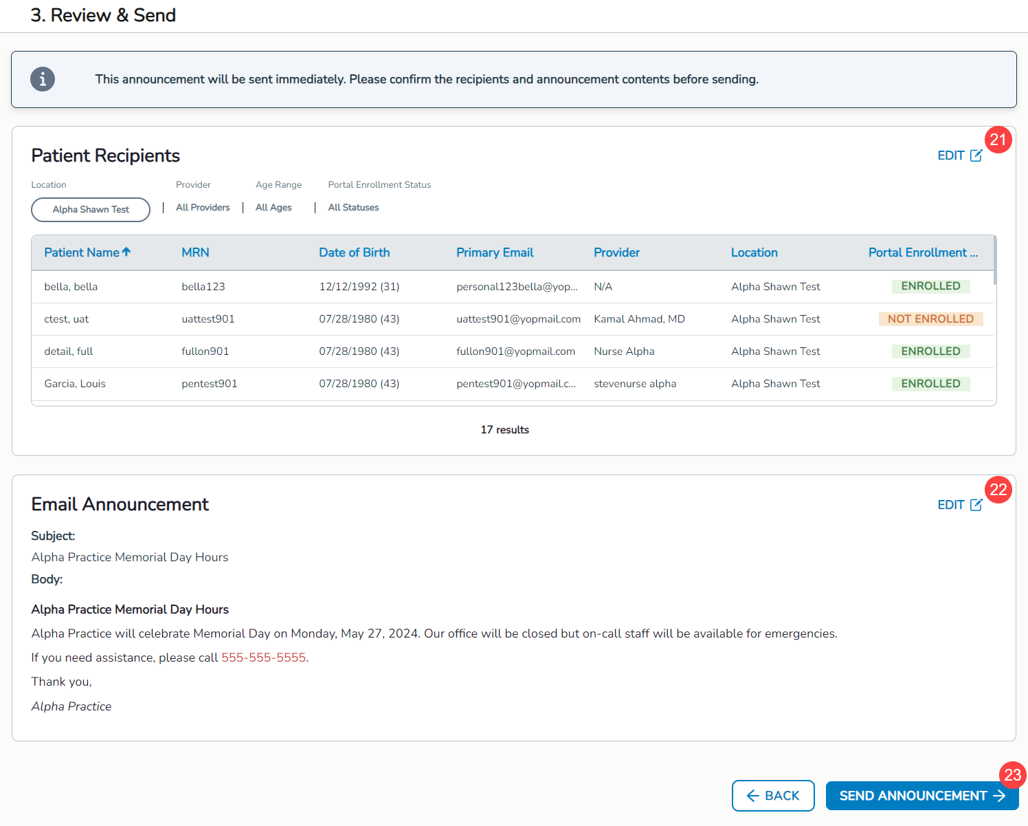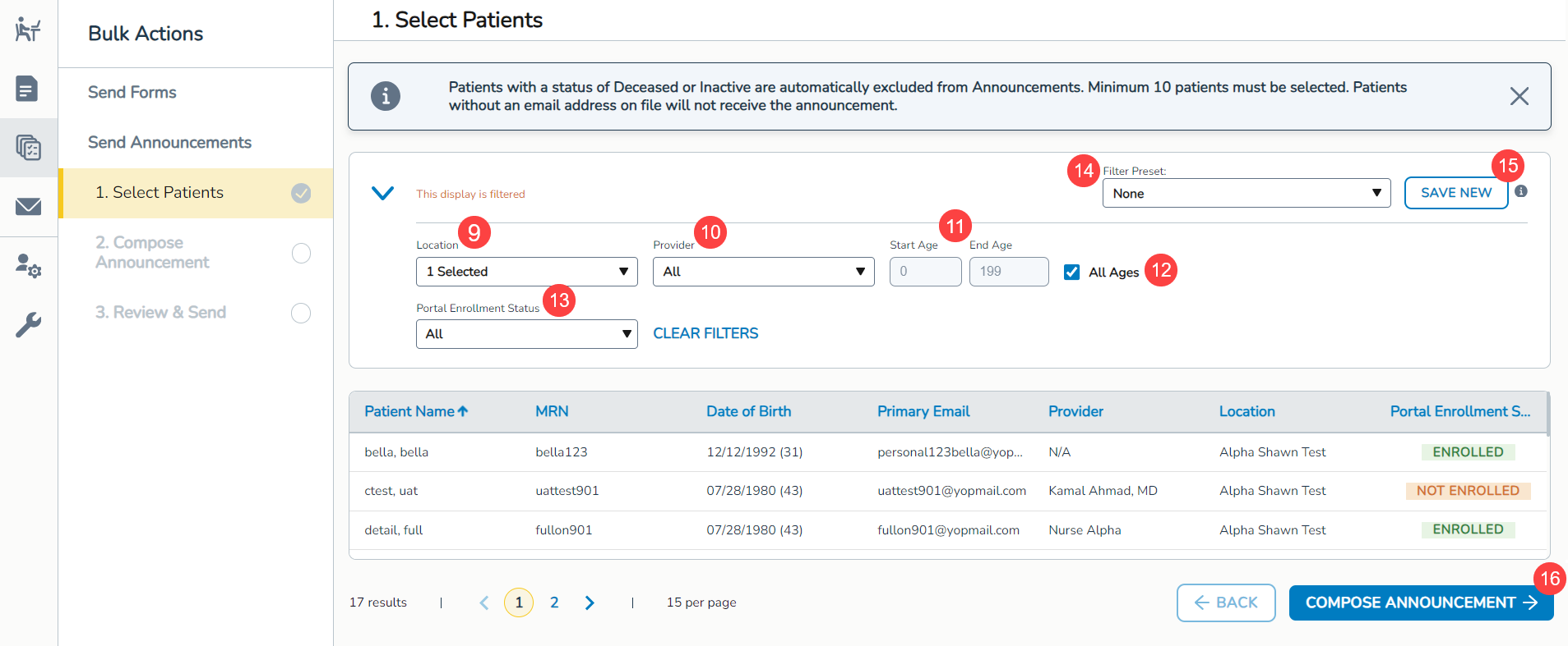 - Click the Compose Announcement button (callout 16) once at least 10 patients are selected (deceased or inactive patients cannot be added).