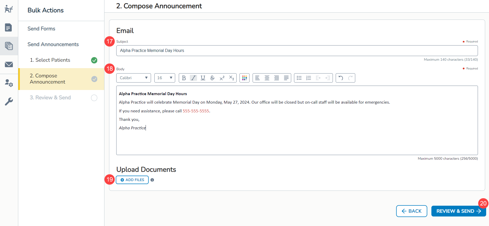 - Click Review & Send to review your message (callout 20).