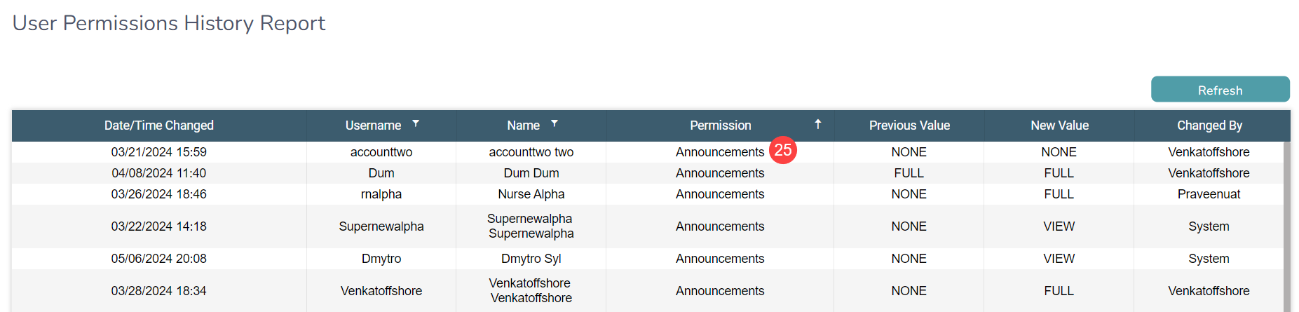 - Lists Announcements under the Permission column when changes are made, providing a comprehensive audit trail (callout 25).