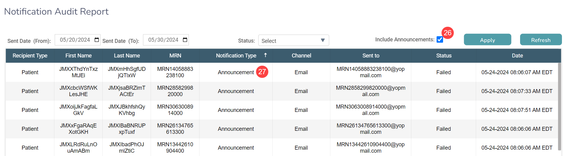 - The report will list Announcement under the Notification Type column when announcements are sent to patients, giving a detailed view and status of all notifications sent by the system (callout 27).