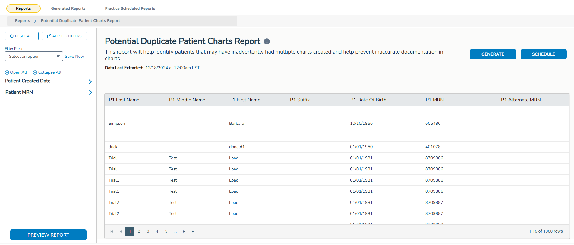 Users with Administration, Clinical Support Solution, Front Office, and Office Manager permission can access the Potential Duplicate Patient Chart Report. This report helps identify instances where multiple charts may have been inadvertently created for the same patient.