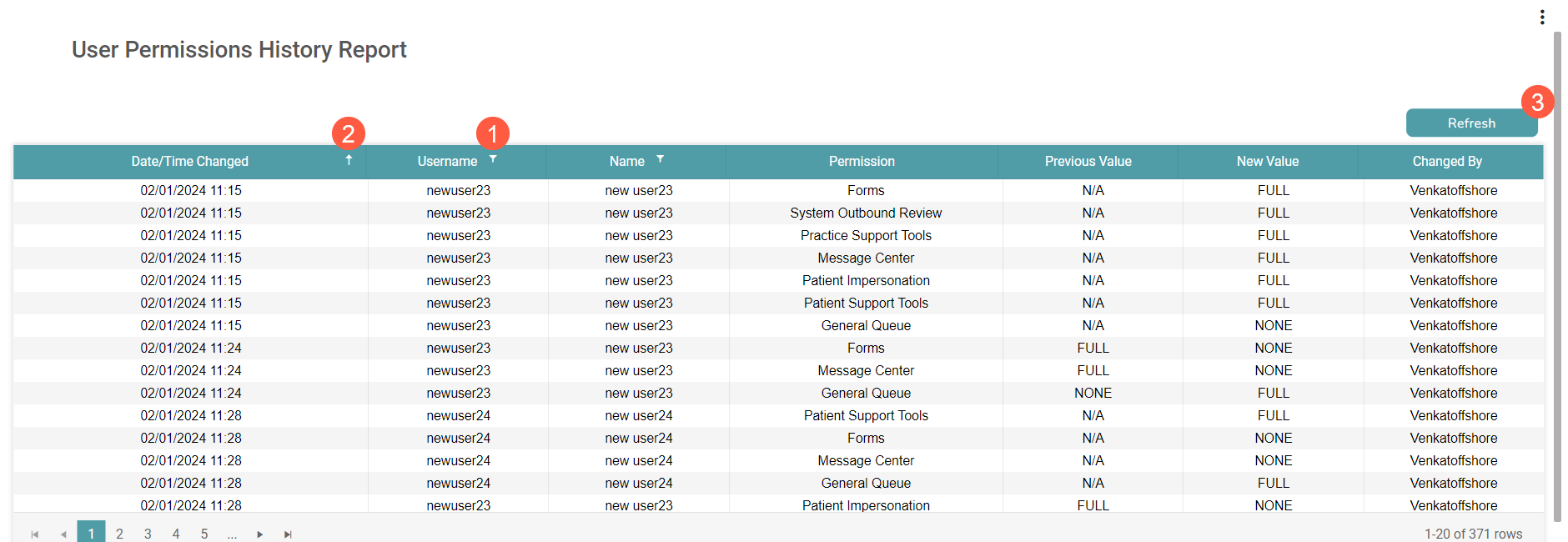 Filter the table by clicking the filter icon on each column (callout 1) to view the most relevant information. Click the title of each column to sort it in ascending or descending order (callout 2). Lastly, you can Refresh the table as needed to see the latest data (callout 3).